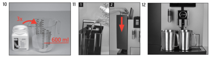 - Dissolvez entièrement 3 pastilles de détartrage JURA dans le récipient. Cela peut prendre quelques minutes; (image.10)